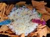 gesnipperde ui,paprika en tomaat (deze ontdoen van het binnenste vocht)als laatste bestrooien met geraspte pittige kaas een rand van chips langs het kaasmengsel leggen of de chips er apart bij doen