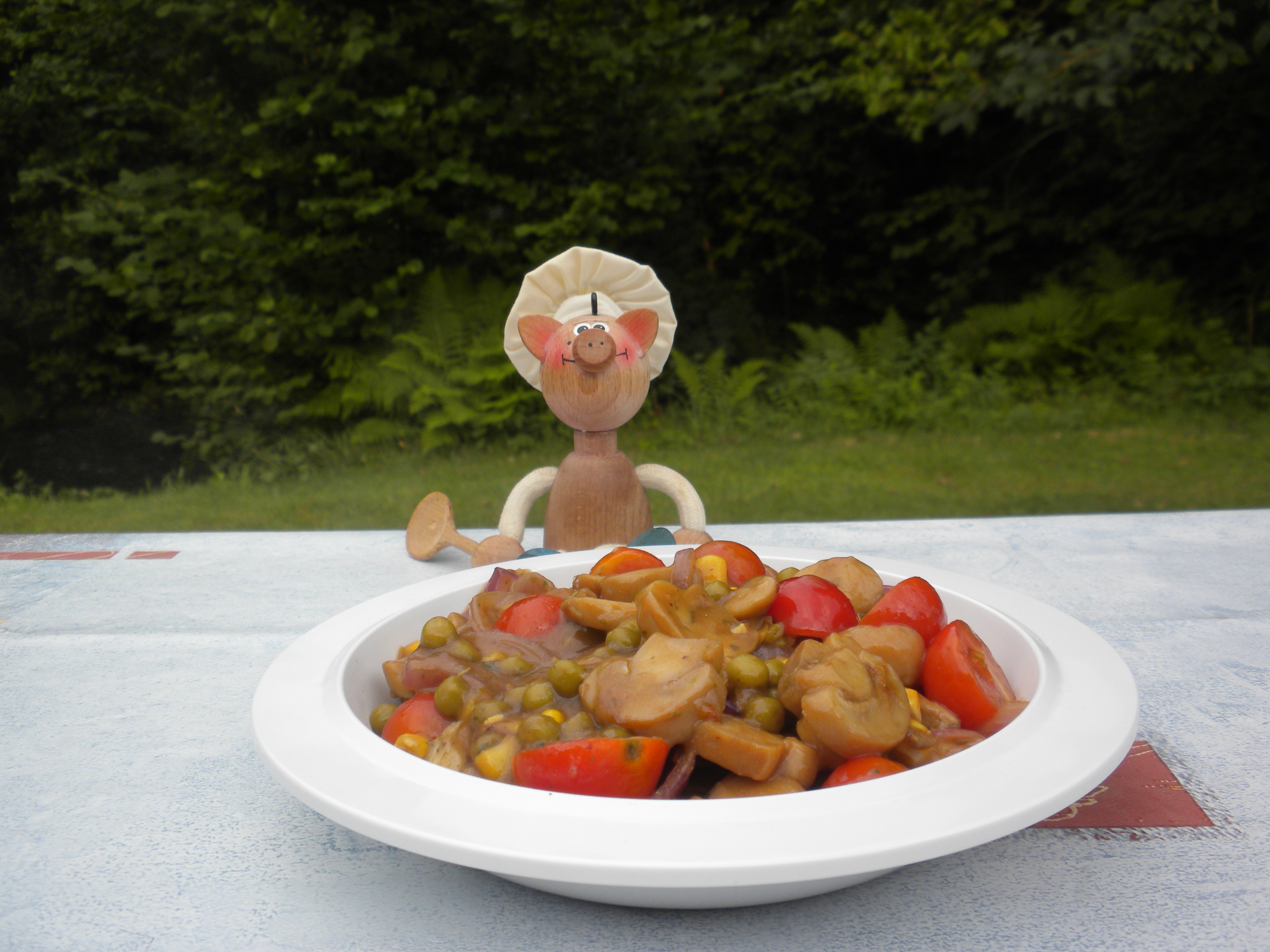Champignons en ajuin even aanstoven in boter voeg de tomaatjes, erwten en mais toe dit alles goed kruiden en wijn toevoegen. Laat goed opwarmen indien nodig de saus binden.