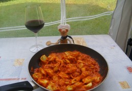 - Kook de gevulde pasta +/- 6à 8 min in licht gezouten water. Stoof de fijn gesneden ajuin even aan in een beetje boter voeg de tomatencoullis toe en de pasta. Laat goed opwarmen serveer er heerlijk stukje stokbrood bij en zeker niet vergeten een heerlijk glaasje rode wijn.
