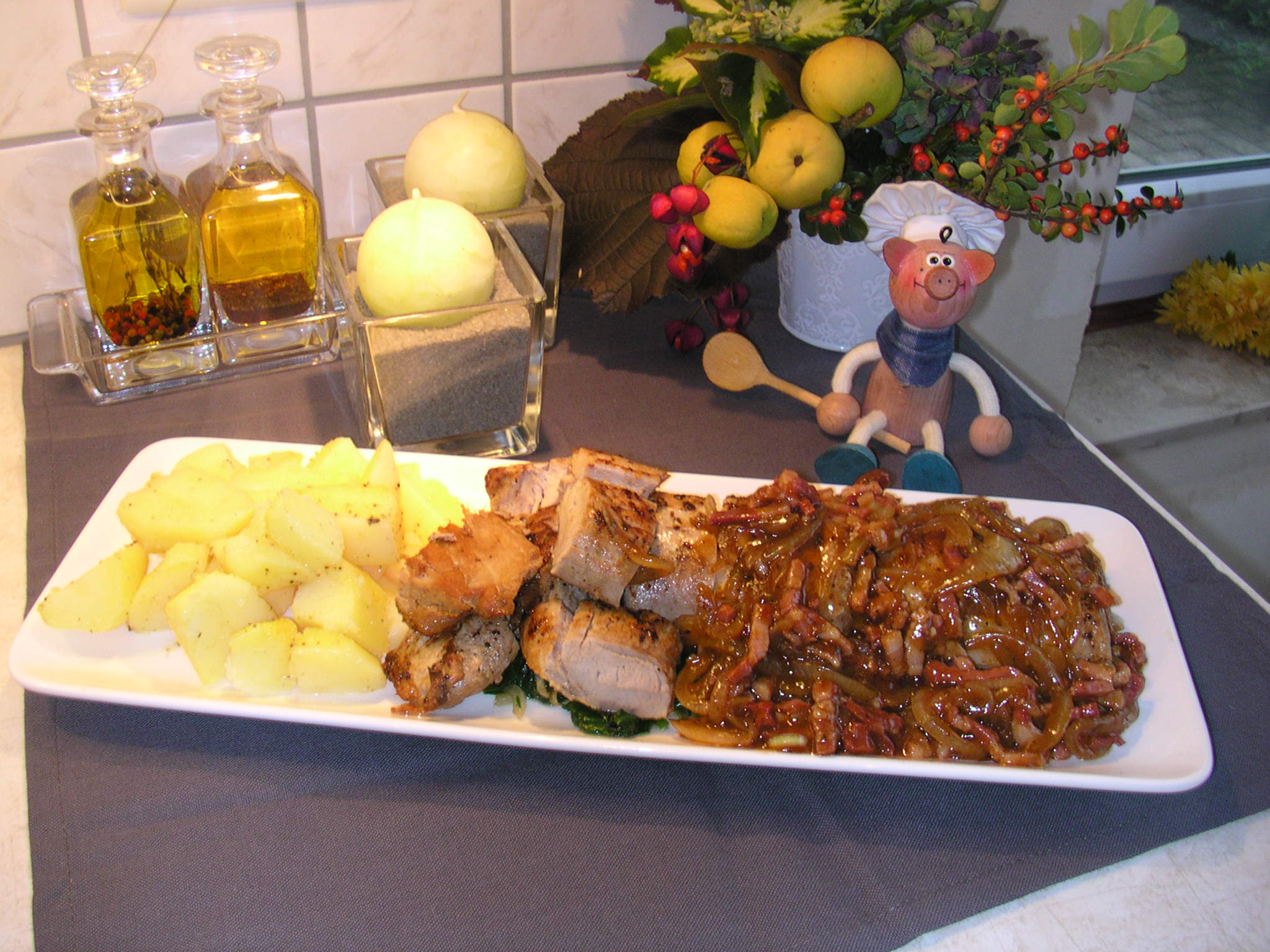 Varkenshaasje met gerookt spek en spinazie