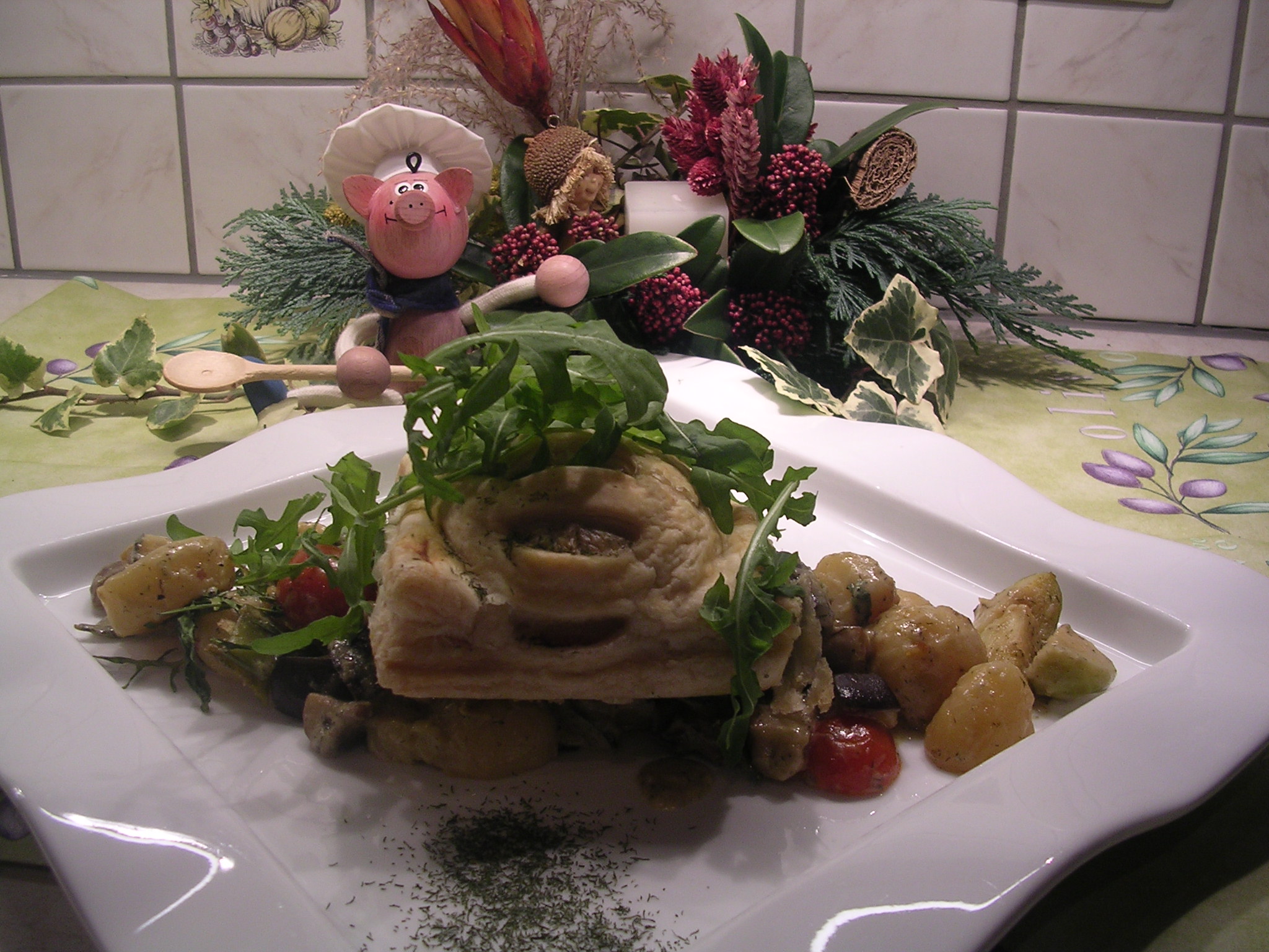 Dep de vis droog en kruid met peper en dille .Bak de vis aan weerszijden aan in olijfolie.Neem het bladerdeeg en leg de vis erop smeer de randen in met ei en leg terug bladerdeeg duw lichtjes aan en maak inkepingen met de schaar.Laat dit gedurende 30min bakken in voorverwarmde oven op 180gr.Krieltjes beetgaar koken met een beetje zeezout .Stoof de groenten beetgaar in boter met gemalen peper en dille voeg de mierikswortel ,room en gorgonzola toe en evenzeer de krieltjes als laatste de kerstomaatjes.Stoof dit geheel even op.Dresseer dit met de vis op bord en garneer af met ruccola.